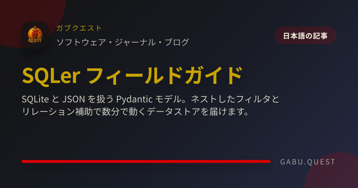 SQLer フィールドガイド SQLite と JSON を扱う Pydantic モデル。ネストしたフィルタとリレーション補助で数分で動くデータストアを届けます。 PythonPydanticSQLiteSQL